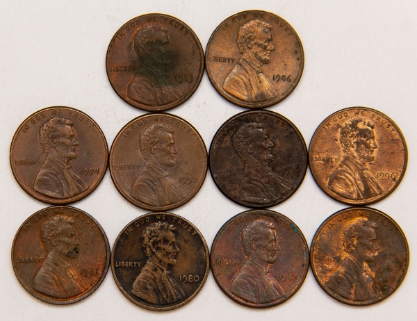 • Numismática, E.U.A.. 10 Moedas One Cent. Datas variadas.