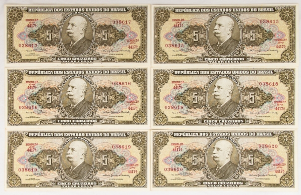 • Numismática, Brasil. Lote com 6 Cédulas 5 Cruzeiros. Seriadas. Flor de Estampa.