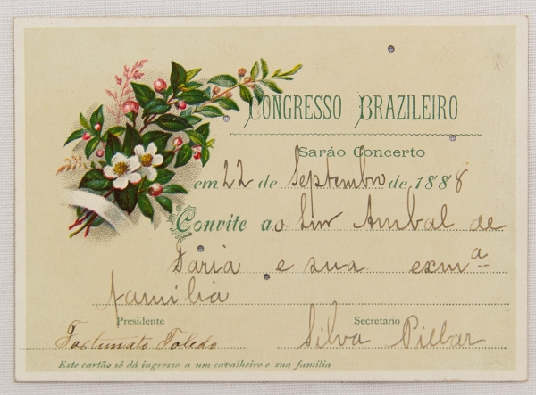 • Colecionismo - Antigo convite - Para `Congresso Brazileiro` - Sárao Concerto - 22 setembro de 1888 (Brasil Império) - Convidam casal e família - Assinam presidente e secretário - Verso com número do convite a mão - possui pequenos furos de traça - nada que prejudique a integridade e originalidade da peça
