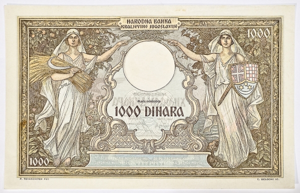 • Numismática, Yugoslavia. Cédula de 1000 Dinaras 1931 P-29a SOB/FE