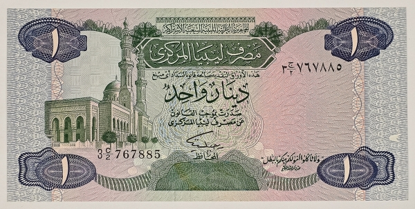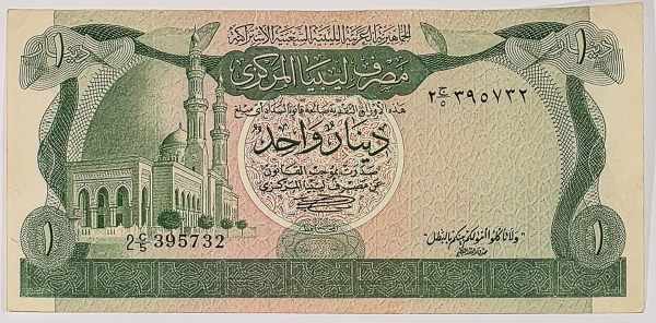 • Numismática, Lybia. Cédula de 1 Dinar 1984 P-49a Sob++/FE
