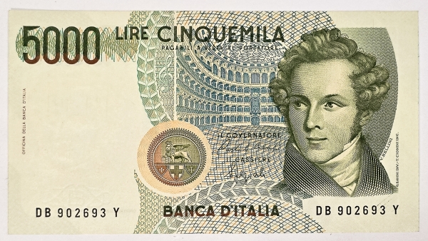• Numismática, Italia. Cédula de 5000 Lire FE