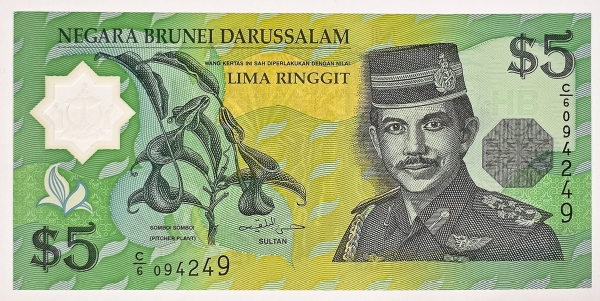 • Numismática, Brunei. Cédula de 5 Dollars 2002 Polimero FE