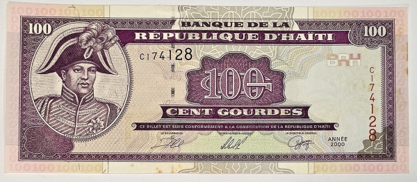 • Numismática, Haiti. Cédula de 100 Gourges FE Manchas