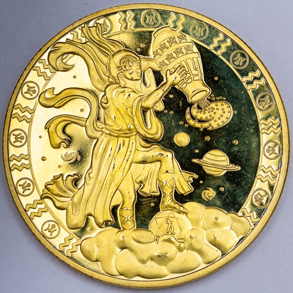 • Numismática, Brasil. Moeda comemorativa do Zodíaco, signo de Aquário, folheada a ouro 24K, 40mm.