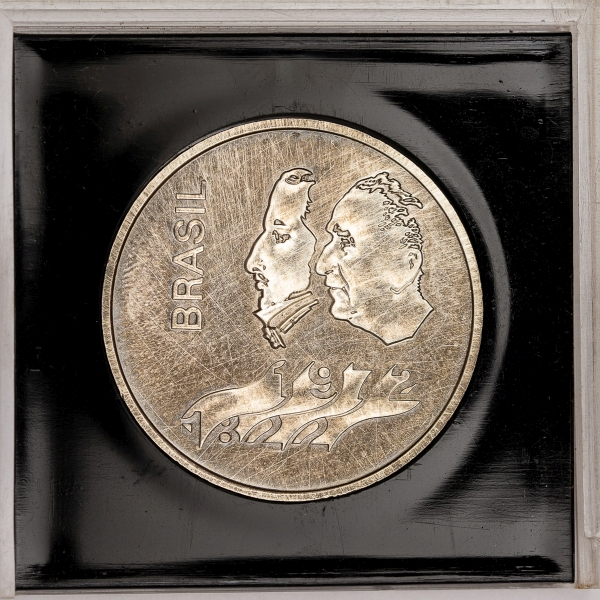 • Numismática, Brasil. Moeda de 20 Cruzeiros, 1972. Sesquicentenário da Independência, Prata. Na caixa de acrílico do Banco Central.