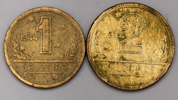 • Numismática, Brasil. Lote com 2 moedas de 1 e 2 Cruzeiros, ano 1944. Complete sua coleção.