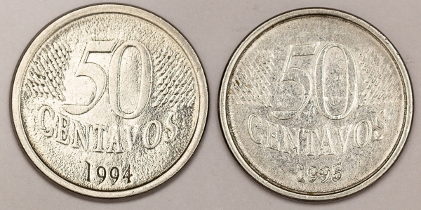 • Numismática, Brasil. Lote com 2 moedas de 50 Centavos. Sendo 1 de 1994, disco fino. Além de 50 Centavos, 1995, batida dupla na data e data vazada no reverso acima da cabeça.
