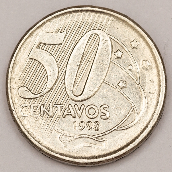 • Numismática, Brasil. Moeda de 50 Centavos, ano 1998. Tiragem 24.900.000. Reverso inclinado à direita. Escassa. V.518