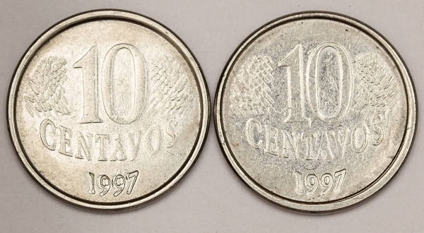 • Numismática, Brasil. Lote com 2 moedas de 10 Centavos, 1997. 1 com batida dupla na palavra `Centavo` e data. 1 com sobra de metal na palavra `Brasil`. V.449. Oportunidade.