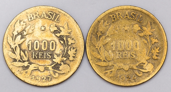 • Numismática, Brasil. Lote com 2 moedas de 1000 Réis, ano 1924 e 1947. Símbolo da Fortuna. Em bronze e alumínio, 27mm. Escassas.