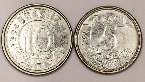 • Numismática, Brasil. Série com 2 moedas. 5 e 10 Cruzeiros Reais, 1994. Arara e Tamanduá. V. 431 e V. 433. Escassas. FC (Flor de Cunho).