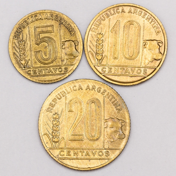 • Numismática, Argentina. 5, 10 e 20 Centavos, ano 1943. Escassas. Oportunidade.
