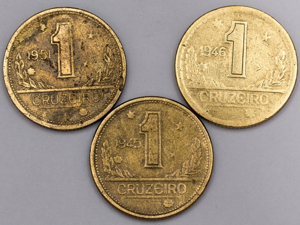 • Numismática, Brasil. Lote com 3 moedas de 1 Cruzeiro, anos 1945, 1946 e 1950. Complete sua coleção.