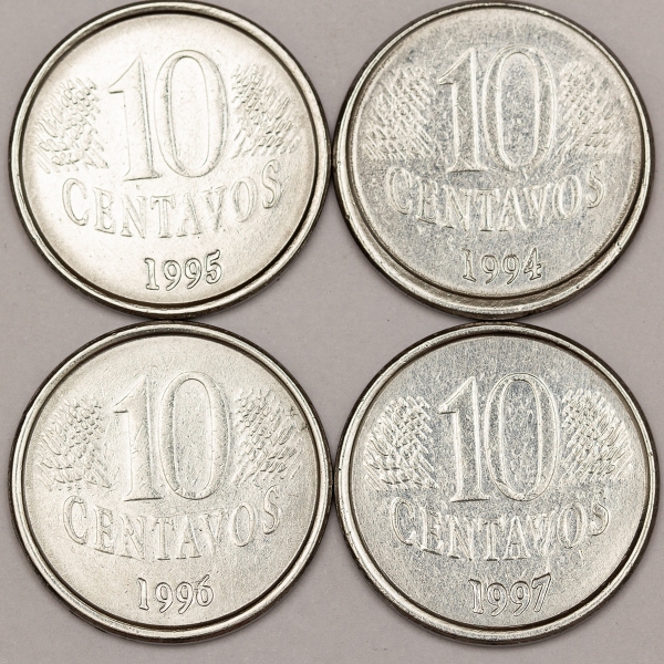 • Numismática, Brasil. Série completa com 4 moedas de 10 Centavos, anos 1994, 1995, 1996 e 1997. Com data vazada no reverso, parte superior, acima da cabeça.