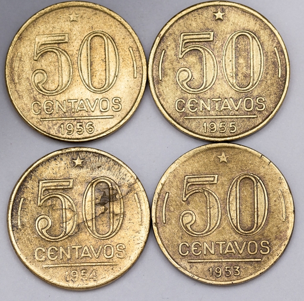• Numismática, Brasil. Lote com 4 moedas de 50 Centavos, anos 1953, 1954, 1955 e 1956. Presidente Dutra. Complete sua coleção.