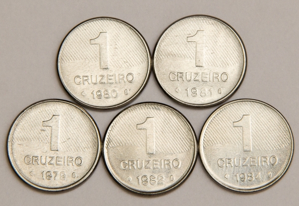 • Numismática, Brasil. Lote com 5 moedas de 1 Cruzeiro, anos 1979, 1980, 1981, 1982 e 1984. Série Cana-de-Açúcar. Escassas.