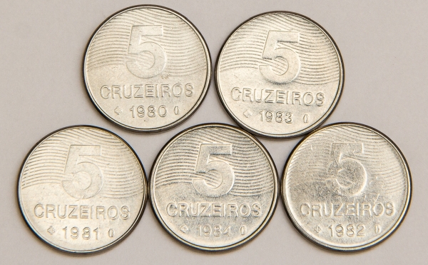 • Numismática, Brasil. Série com 5 moedas de 5 Cruzeiros, anos 1980, 1981, 1982, 1983 e 1984. Série Café. Escassas.