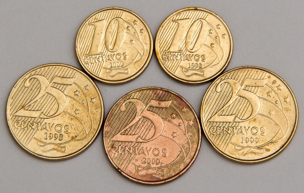 • Numismática, Brasil. Lote com 5 moedas. Sendo 3 de 25 Centavos, anos 1998, 1999 e 2000. Além de 2 de 10 Centavos, 1998 e 2000. Escassas.