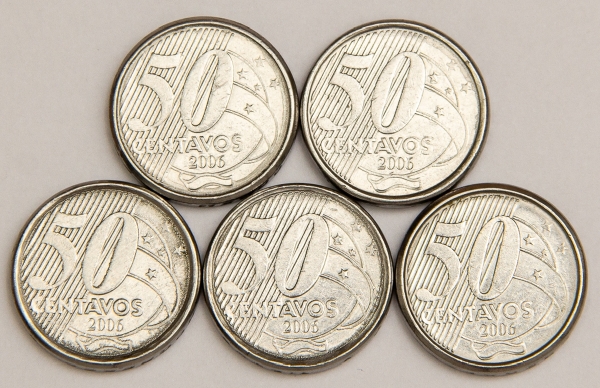 • Numismática, Brasil. Lote com 5 moedas de 50 Centavos, ano 2006. Escassas. V. 524.