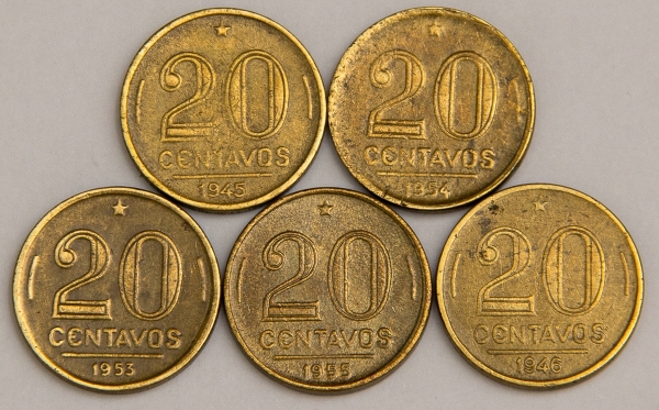 • Numismática, Brasil. Lote com 5 moedas de 20 Centavos. Anos 1953, 1954 e 1955 (Rui Barbosa). E 1945 e 1946 (Getúlio Vargas). Complete sua coleção.
