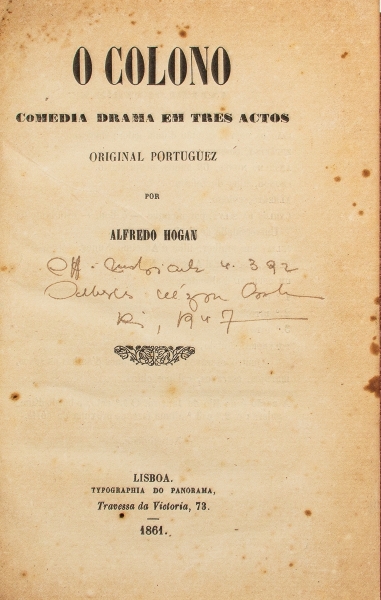 • Livro: HOGAN, Alfredo. `O Colono`, comédia drama em três atos, 1ª edição. Lisboa: Tipografia do Panorama, 1861; 46p. Enc.