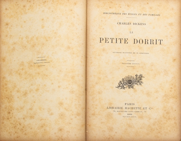 • Livro: DICKENS, Charles. `Le Petit Dorrit`. Ouvrage illustré de 35 gravures. Paris: Hachette, 1896; 320p. Enc. do editor. Douração nos cortes.