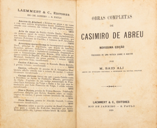 • Livro: ABREU, Casimiro de. `Obras Completas`. Novíssima edição, precedida de uma notícia sobre o autor por M. Said Ali. Rio de Janeiro: Laemmert, 1895; 238p. Enc. original do editor.