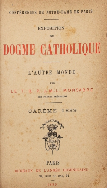• Livro: MONSABRÉ, J.M.L. `Exposition du Dogme Catholique`, L`Autre Monde. Paris: Bureaux de L`Année Dominicaine, 1889; 336p. Enc. com as capas. Ex-Libris de antigo dono na fl. de guarda.