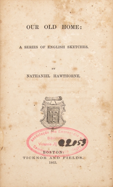 • Livro: HAWTHORNE, Nathaniel. `Our Old Home: A Series of English Sketches`, 1ª edição. Boston: Ticknor and Fields, 1863; 398p. Enc. do editor, em tecido. Indicação de extinta biblioteca particular no verso da capa.