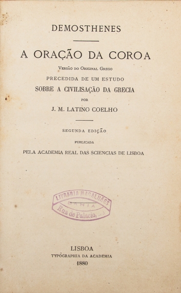• Livro: DEMÓSTENES. `A Oração da Coroa`, Versão do original grego, precedida de um estudo sobre a civilização da Grécia por J. M. Latino Coelho. Lisboa: Tipografia da Academia, 1880; CDXVII + 105p. Enc. (perda da lombada). 1 Furo de inseto na margem das 3 fls. finais, fora do texto.