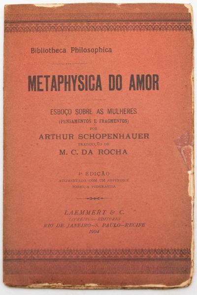 • Livro: SCHOPENHAUER, Arthur. `Metafísica do Amor`, Esboço sobre as mulheres (pensamentos e fragmentos), tradução de M.C. da Rocha. Rio de Janeiro: Laemmert, 1904; 99p. Broch, por abrir.