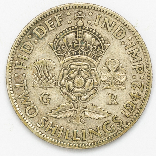 • Numismática, INGLATERRA. Uma Moeda de Prata KM#855 2 Shillings 1942