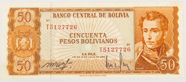 • Numismática, BOLIVIA. Uma Cédula P-156 50 Pesos 1962