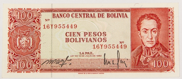 • Numismática, BOLIVIA. Uma Cédula P-157 100 Pesos 1962 Flor de Estampa