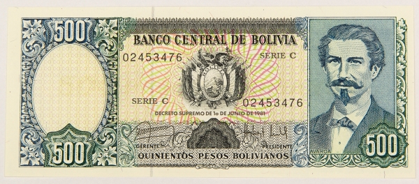 • Numismática, BOLIVIA. Uma Cédula P-165 500 Pesos 1981 Flor de Estampa