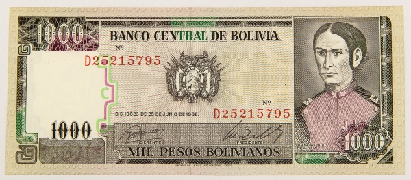 • Numismática, BOLIVIA. Uma Cédula P-167 1000 Pesos 1982 Flor de Estampa
