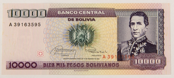 • Numismática, BOLIVIA. Uma Cédula P-169 10000 Pesos 1984 Flor de Estampa