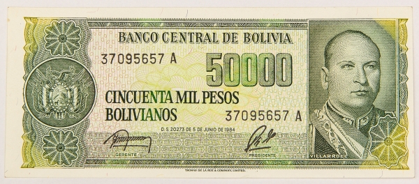 • Numismática, BOLIVIA. Uma Cédula P-170 50000 Pesos 1984 Flor de Estampa