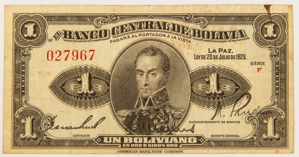• Numismática, BOLIVIA. Uma Cédula P-119 1 Boliviano 1928