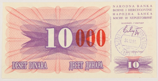 • Numismática, BOSNIA. Uma Cédula P-53a 10000 Dinara 1993 Flor de Estampa