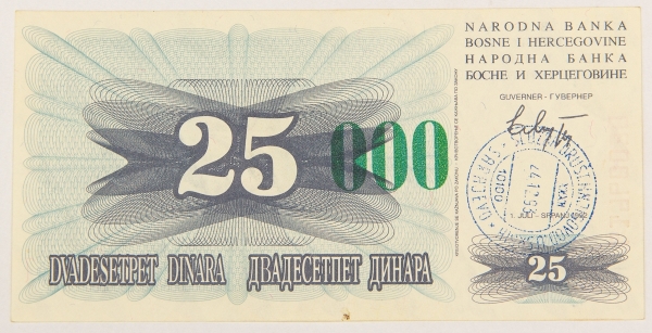 • Numismática, BOSNIA. Uma Cédula P-54a 25000 Dinara 1993 Flor de Estampa