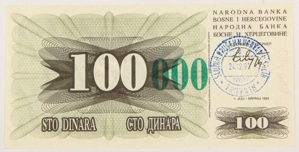 • Numismática, BOSNIA. Uma Cédula P-56a 100000 Dinara 1993 Flor de Estampa
