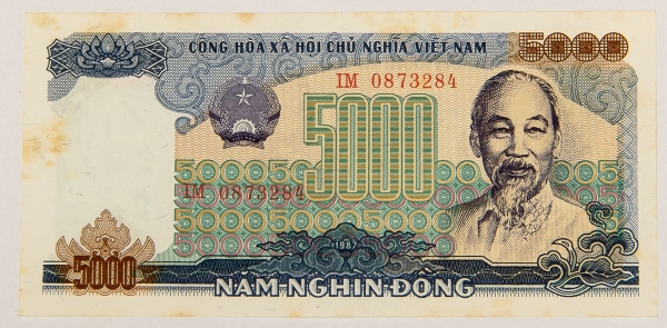 • Numismática, VIETNAM. Uma Cédula P-104 5000 Dong 1987 Flor de Estampa