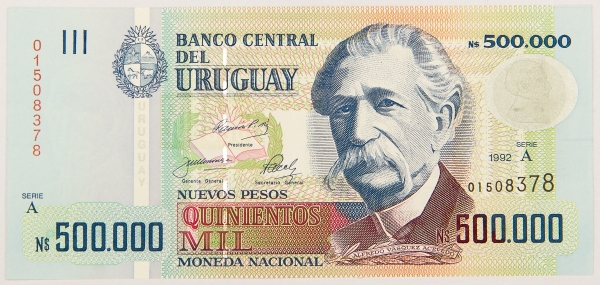 • Numismática, URUGUAY. Uma Cédula P-73 500000 Nuevos Pesos 1982 Flor de Estampa Cat.500