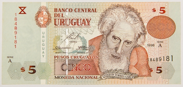 • Numismática, URUGUAY. Uma Cédula 5 Pesos 1998 Flor de Estampa