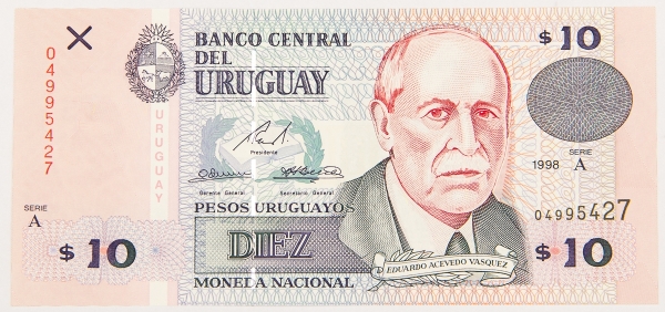 • Numismática, URUGUAY. Uma Cédula 10 Pesos 1998 Flor de Estampa