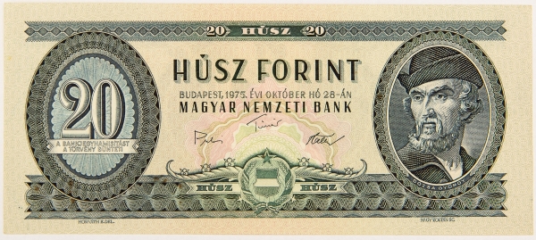 • Numismática, HUNGRIA. Uma Cédula 20 Forint 1975 Flor de Estampa