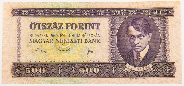 • Numismática, HUNGRIA. Uma Cédula 500 Forint 1969 Flor de Estampa