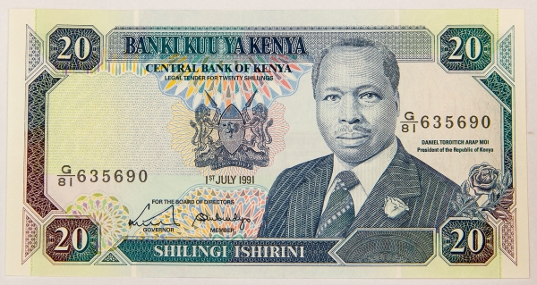 • Numismática, KENYA. Uma Cédula 20 Shillings 1991